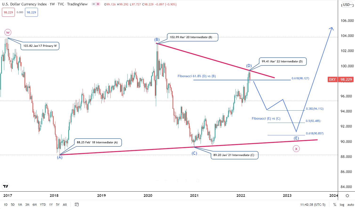 Inflation has been hot for over a year now and the FED has been warning of raising rates. The Buck has been on an upward trend since the 89.20 Jan’ 21 Intermediate (C) low. You would have thought that the FED tightening would have continued the bullish trend. For the week, this was not the case though. And the Elliott Wave structure also points to more dowside for the buck for at least a year or so. The Elliott Wave pattern at the 99.41 March’ 22 high counts a complete zigzag for Intermediate (C) of a triangle most likely taking place. And, notice that this week’s candle is inside last weeks which warns of a reversal. Also, Intermediate Fibonacci 61.8% (D) vs (B) target have been reached. If this count is correct, the index is expected to drop to the 90.85 Fibonacci 61.8% (E) vs (C) where Intermediate (E) terminates Primary X. From there the longer term trend from the 70.09 March’ 08 low should resume.
