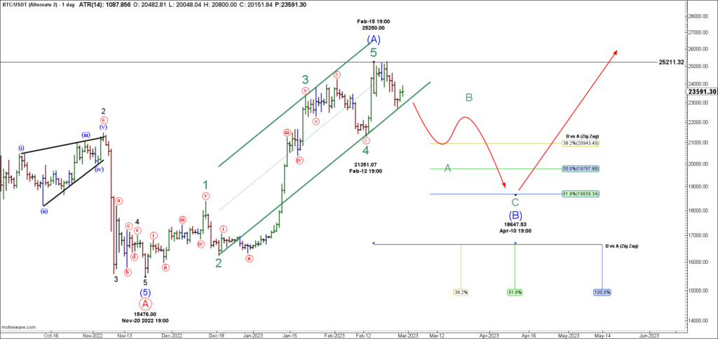 5 waves are complete at the $25250.00 Feb 15th high for a cap of Intermediate degree (A). We can now expect an Intermediate Degree (B) wave to correct this impulse. The benchmark crypto currency is expected to push through Minor Degree lower channel trend line for a test of the $21351.07 Minor Degree 4 low.