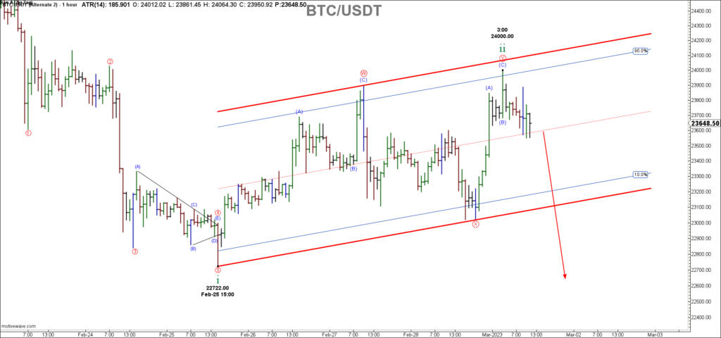 Decomposing down to a 1-hour chart, one can see that a double zigzag has formed at the $24000.00 high. Notice also that price has since dropped off and is now testing the Micro Degree middle channel trend line support for the third time in three hours.