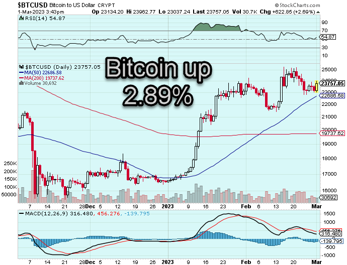Bitcoin is up +2.89% so far this morning. The benchmark crypto opened at 23134.20 moved down to a low at $20037.24 before moving up strongly to a intraday high of $23962.77. Currently, price is trading at the $23757.05.