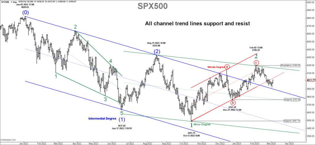 The United States SPX500 is positive for second day as sentiment improves a bit. However, the longer term risk is still to the downside. The Elliott Wave structure is still intact with today’s price action below the Red Minute Degree Channel and 4.53% below 4196.55 Minor Degree high put in on Feb 2. Notice that Minor Degree 2 has moved outside the blue 1-2 Intermediate Degree channel zone. This is the only sign supporting a move to the upside. However, these outside moves do occur. The important downside signals which is the Elliott Wave structure is still warning the longer term downside move.