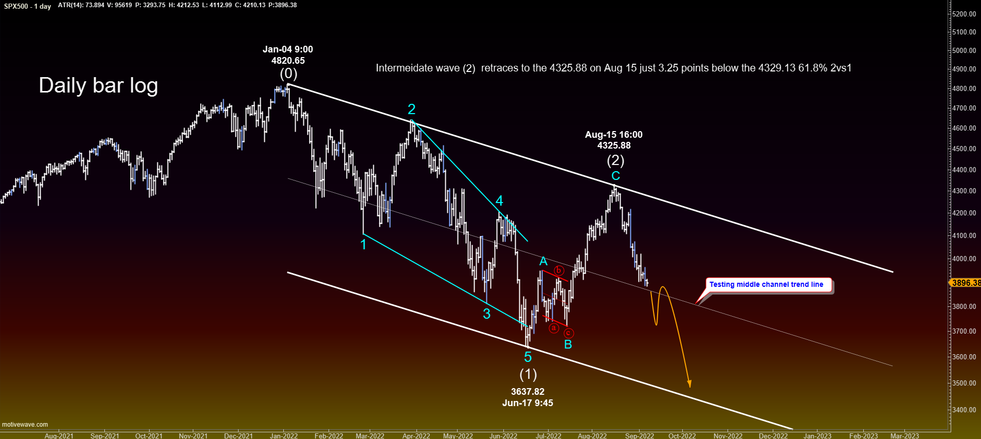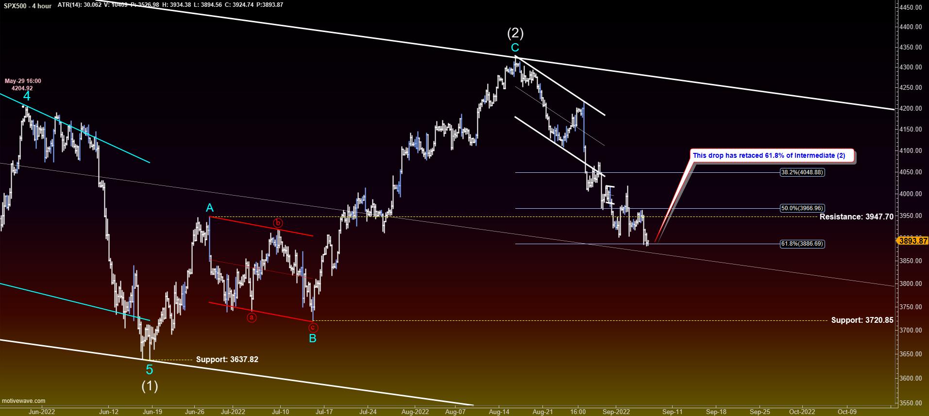 The SPX 500 is 19.44% below its 4820.65 Jan 4th all-time high. Both stocks and bonds have been sold for five days straight. The SPX 500, after retracing 61.8% of the drop it took off the all-time high, fell back on its downward trend dropping below the 38.2% and well into previous Minor Degree-B correction zone. Resistance for this zone is the 3947.70 and Support is a the 3720.85. Currently price is at the 3890.61.