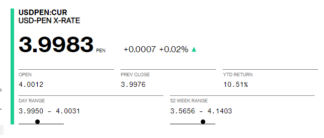 Hoy el precio del dólar en Perú apertura a 4.0012 por arriba del cierre del ayer (3.9976) según Bloomberg.com, en las casas de cambio de Miraflores se encuentra a 3.98 y 4.02 para la venta, el mismo nivel que registró en la jornada previa.