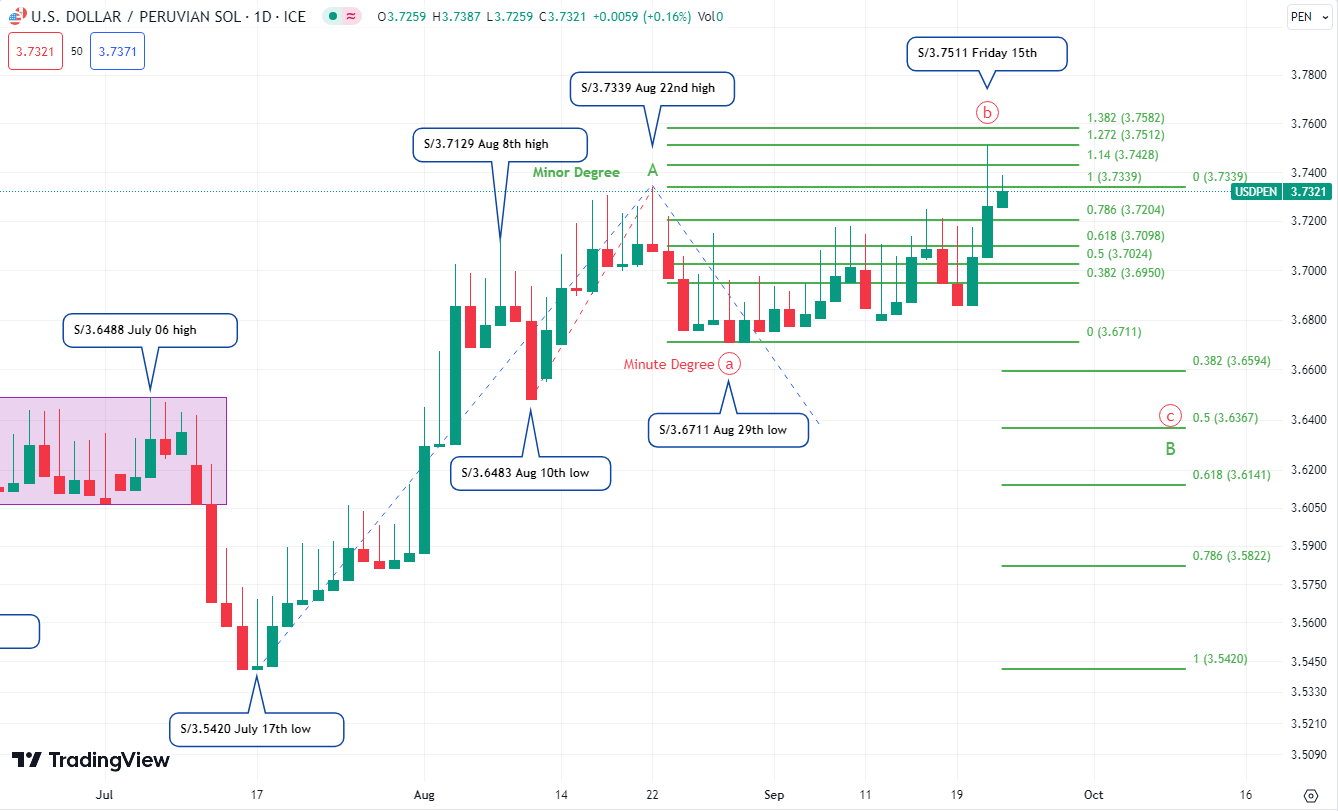 La estructura que se desarrolla a partir de Minor Degree Wave-A parece ser parte de una estructura correctiva de expansión plana en curso para Minor Wave-B. Esto se confirma con el fallo en el nivel de 1.272% de Minute degree BvsA en S/3.7512.