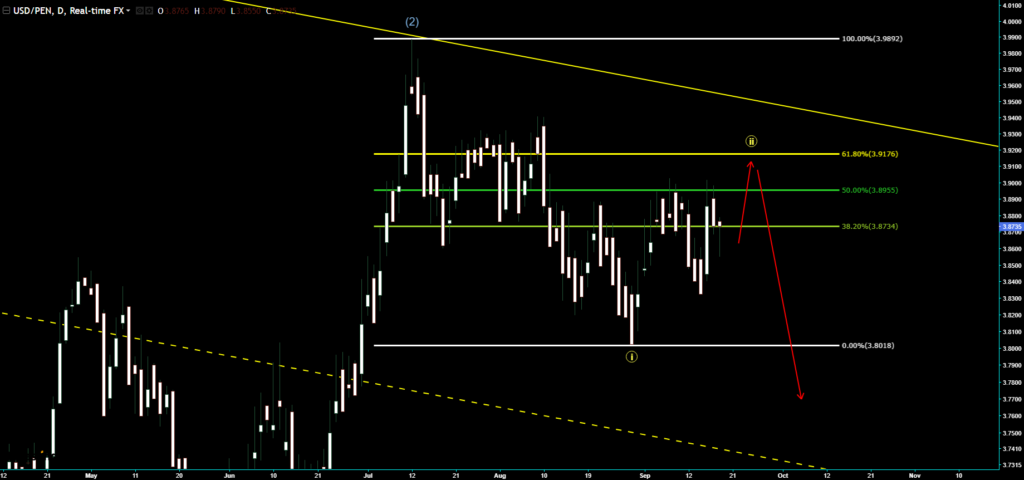 USD DOLLAR PERUVIAN SOL Publicado el 19 September 202219 September 2022 EWFOREX.NET USD/PEN 3.8751; EUR/USD $1.002; BITCOIN $19545 GOLD $1675; USOIL 85.39 Dollar Sol upside 3.9122 61.8% retrace of leading diagonal. Elliott Wave Structure Please follow and like us: